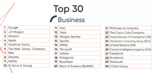 尽管快速消费品和零售行业对商科学生的吸引力正在下降,但我们看到诸如Spotify和Buzzfee之类的新生力量进入了前30名,因为他们拥护着毕业生们的就业偏好。就职业目标而言,学生们现在更热衷于能够平衡工作和生活、稳定、有领导力的公司。
