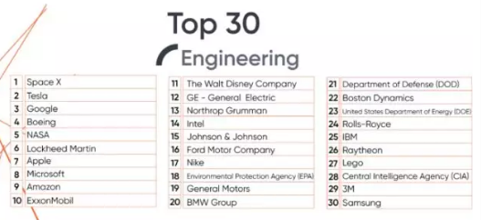 工程领域的前 30 名排名主要由公共部门 / 政府,航空航天和汽车公司主导。 尽管创新是吸引工程毕业生的因因素之一,但高收入和富有创造力的公司才是他们的首选。从结果来看, Space X ,xxonMobil, 和 Intel 对学生的吸引力在大大提升,但公共和政府部门依旧排在前位。