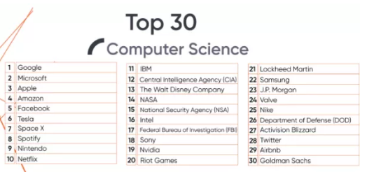 2019年计算机科学专业毕业生优先选择的公司排名情况: