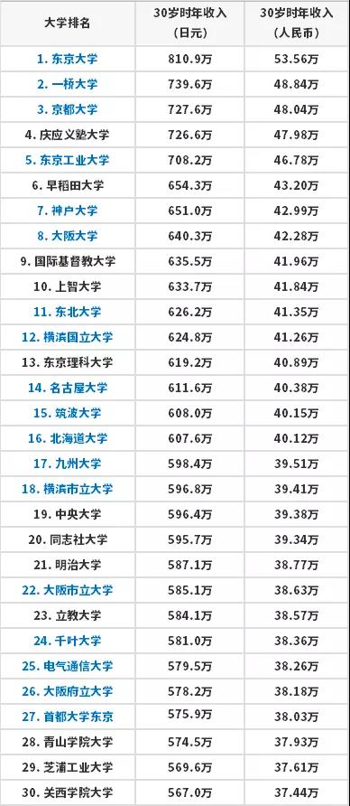 该网站在2018年3月至2019年7月期间对1万9651人做了数据调查,推算出了日本各大学毕业生到30岁的年收入,并公布了前三十位的排名。
