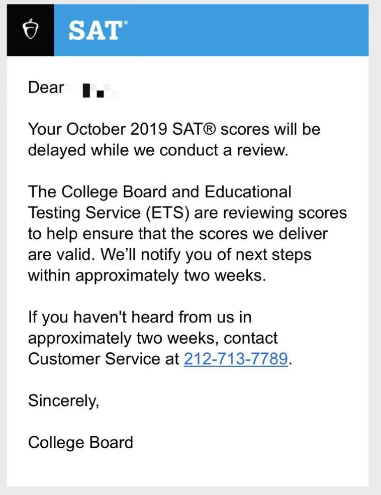 今天早上,10月亚博SAT考试的学生收到了CB的Delay邮件通知,告知学生10月成绩将被延迟。CB和ETS正在核实分数,以确保分数的有效性,2周后告知结果。