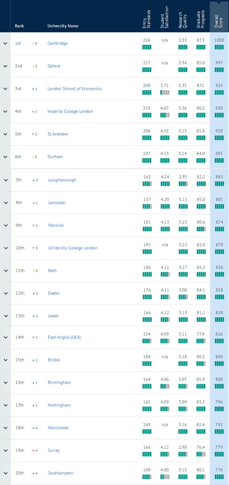 今年排名来看,剑桥大学获得了8连冠,而牛津又一次名列第二,LSE重回前三,圣安德鲁斯跌至第五,拉夫堡大学上升到第七,UCL跌至第十。
