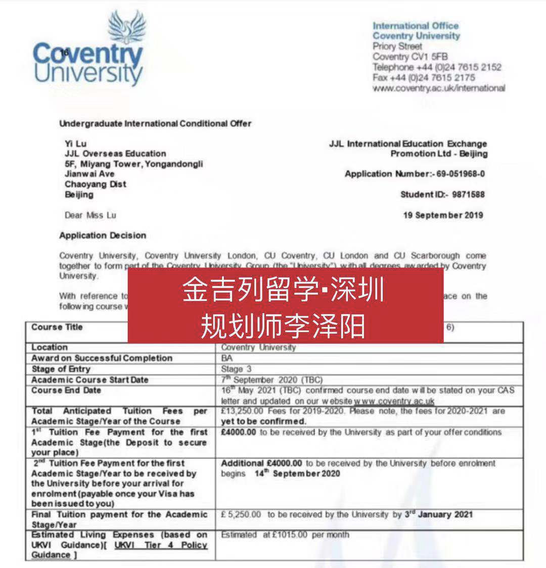 学生情况分析:学生为大专毕业生,在就业过程中遇到了瓶颈,想要通过提升学历来提升自己,想要先top-up拿本科学位后紧接着申请硕士课程,于是在李老师的指导下,学生第一批拿到了考文垂大学专升本的录取