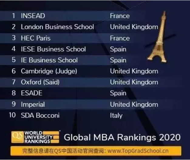 •欧洲商学院在本次排名中表现突出。 欧洲工商管理学院(INSEAD),伦敦商学院(Lonon Business School)和巴黎高等商学院(HEC Paris)也都位列世界MBA前十名。