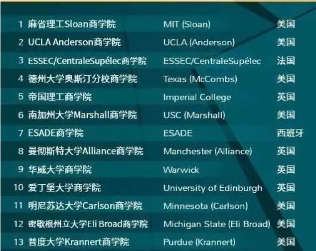 •金融硕士方面,前100中83所来自美国和英国。 牛津大学Sai商学院排名世界第一; 伦敦商学院也位列世界第四; 麻省理工MIT和伯克利、UCLA等三所美国名校进入世界前十,法国的巴黎高等商学院和ESSEC进入世界前十名。