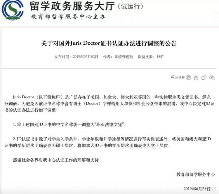 Juris Doctor(以下简称JD)是广泛存在于美国、加拿大、澳大利亚等国的一种法律职业类文凭证书。经充分调研,为避免因该证书名称中含有博士(Doctor)字样给用人单位和社会公众带来的混淆,我中心决定对JD证书的认证办法进行如下调整: