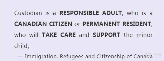 加拿大法律规定,如果海外学生未成年就开始在加拿大读书,必须有一个法定的已成年的监护人(guarian)。 监护人必须是加拿大的公民或者是永久居民,年龄在25周岁以上且居住在学生就读学校的城市。而且监护人必须无任何犯罪或者其他不良记录。监护人可以由家长委派,也可以由申请人所申请的学校来安排。