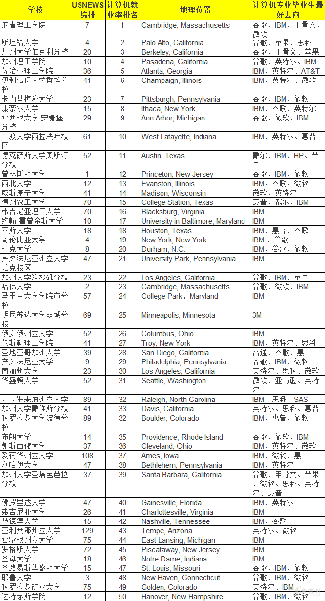 像Facebook、谷歌和苹果这些IT企业在顶级学校有定向人才输送的程序,其中除了常青藤联盟的老牌名校,也有一些在国内知名度不是很高的大学。所以如果你想到美国学习计算机相关专业,可以考虑一下这些学校。今天就给大家分享一下根据就业率排出的美国计算机专业大学五十强: