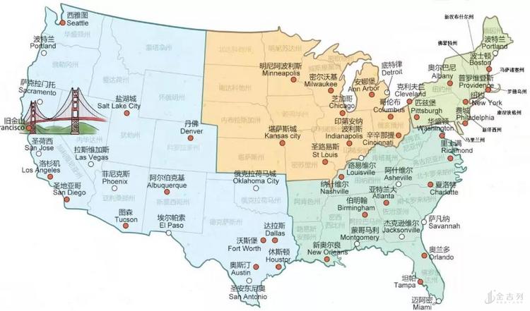 下面我们就来看看美国的大致区域划分及区位优势。美国主要分为5大区域:新英格兰地区、大西洋沿岸、南部、中西部、西部。(不是绝对的,这个只是划分方法的一种)。地图如下