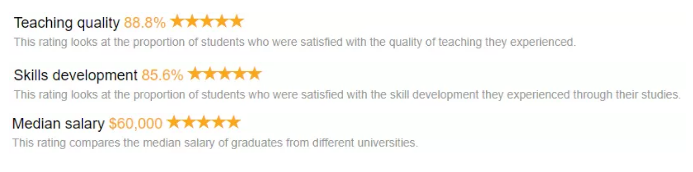但是文科呢?是否同样优秀?根据澳洲权威“高等教育评估”机构 - The Goo Universities Guie发布的最新澳洲高校评估数据显示,VU的人文社科(Humanities an Social Science)教育领域的多项指数都获得了5星好评: