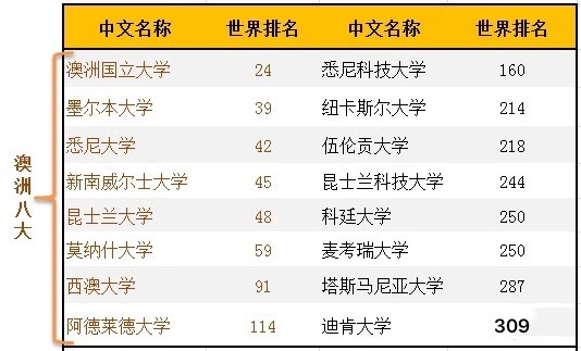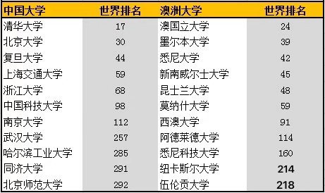 其中 58% 的大学进入世界 TOP500 ,根据表 1 整理,澳洲八大(五星大学,表中左列)排名处于前端,其中 7 所大学进入世界 TOP100 ,多所教学资源雄厚的四星大学进入 TOP300 。 根据表 2 整理(截取排名靠前的大学),从澳洲大学和国内大学 2019QS 世界排名对比来看,澳洲大学整体排名高于国内大学。