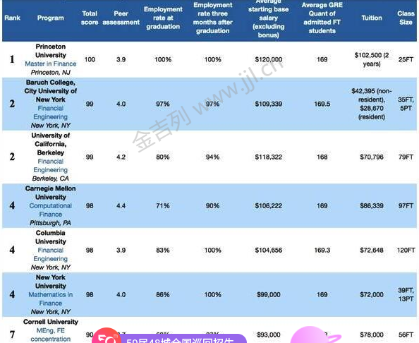 通常选读这个项目的同学都是奔着就业的目的而去,金融工程有STEM加持长达36个月的OPT。我们在择校时往往会依赖各种排名进行判断,在金融工程领域比较权威的排名是QuantNet和TFE Times。相较去年,今年有以下大的变化:Princeton从第五名直接升至第一位,NYU Tanon和MIT挤进前十。