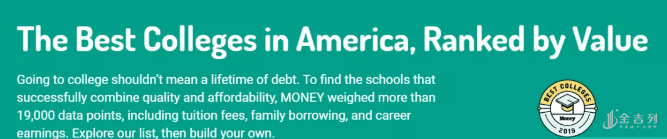 前不久,美国Money杂志在综合了美国教育部,Peterson's,Payscale的数据后,全面分析和对比了一波美国大学的性价比,并评选出了2019年性价比最高的大学排名榜单,MONEY的评比标准主要分为3大类: 教育质量,可承受度和产出 。