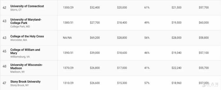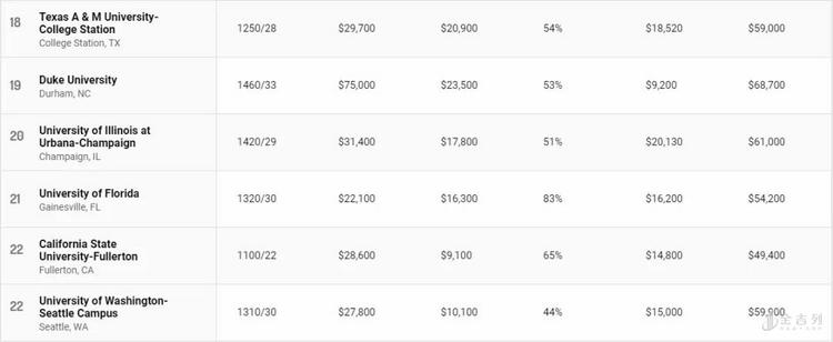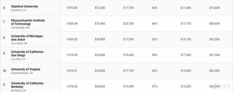 公立大学在榜单上表现亮眼,排名前十位中公立大学占据七席,其中加州大学占据了四个名额。 然而公立大学的“高性价比“与州内学生学费(in-state tuition)相对低廉有关。
