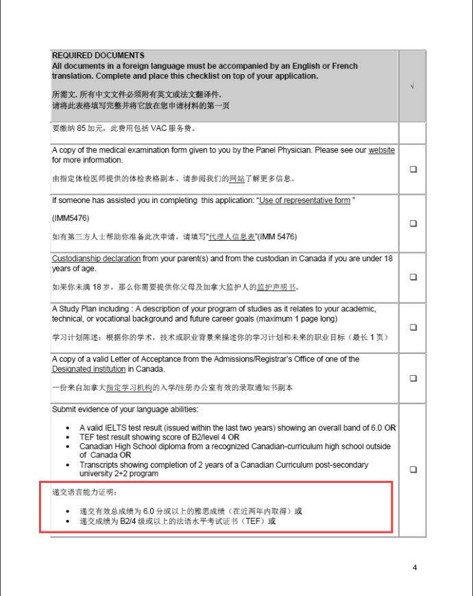 最早的使馆发布会上,针对学习直入计划(SDS计划)要求:雅思总分与各项分数不低于6分,或提交加拿大海外认证高中文凭 。但根据最新的移民局官方文件,实际执行只要求雅思6分,不再要求小分。如下图: