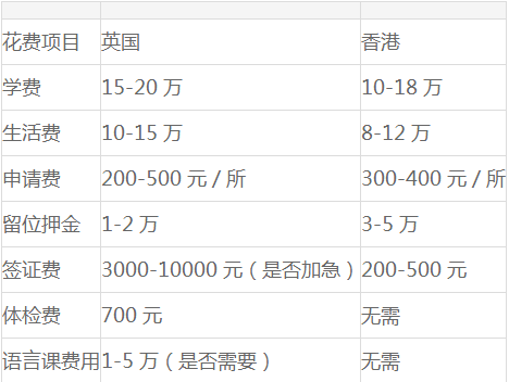 英国香港硕士花费对比:(单位:人民币)