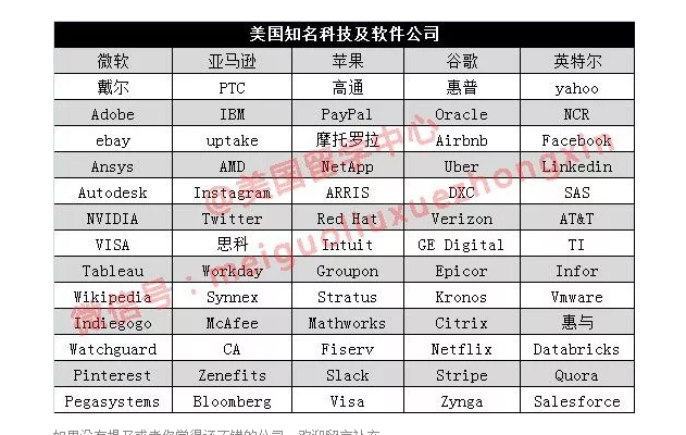 不计其数的IT公司在美国生根发芽,才造就了美国科技的发达。下面简单罗列几个“星光闪闪”的科技公司,排名不分先后,也不过多介绍了,给各位同学“过个眼熟”。