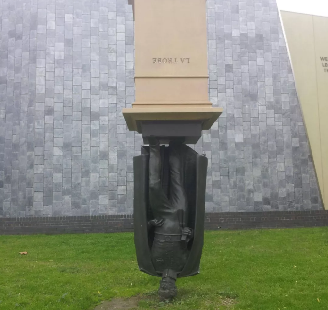 乐卓博大学是以维多利亚州第一任总督Charles Joseph La Trobe来命名的, 创立于1967年。 本来一个学校为了纪念命名的人建立雕像是常有的事,但是这个学校偏偏是倒着放的。 有一种解释就是,这是要寓意学生think out of the box, 跳出固有的框框去思考。 可以说这个铜像就铺垫了这所大学禀性– 创新,不走寻常路。