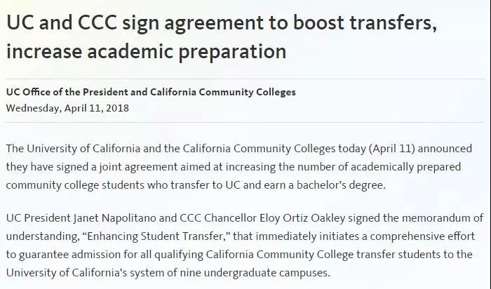 前段时间, University of California 加州大学和 California Community College 加州社区学院这两个大学系统签署了一份 “ 加强学生转学 ” 联合协议,旨在提高加州社区学院成功转入加州大学的学生人数, 2019 年秋季起,保证所有符合条件的加州社区学院学生能成功转学到加州大学系统 9 所分校。