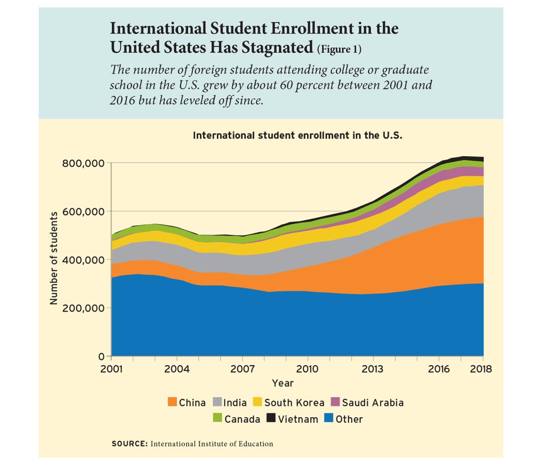 美国一直是最受留学生欢迎的国家,尤其是中国留学生,从图表就能看出,中国学生从 2010年开始快速增长,所占 比例一直稳居第一。