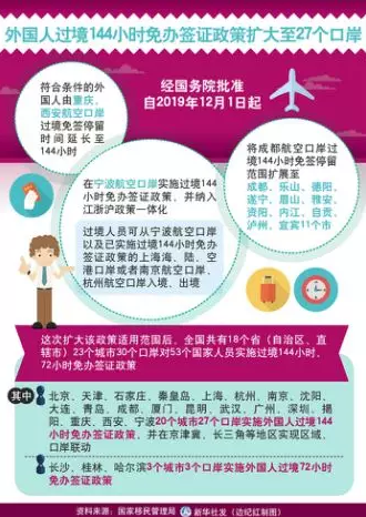 其中,北京、天津、石家庄、秦皇岛、上海、杭州、南京、沈阳、大连、青岛、成都、厦门、昆明、武汉、广州、深圳、揭阳、重庆、西安、宁波20个城市27个口岸实施外国人过境144小时免办签证政策,并在京津冀、长三角等地区实现区域、口岸联动;