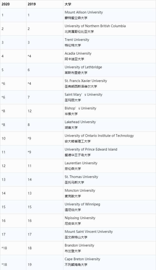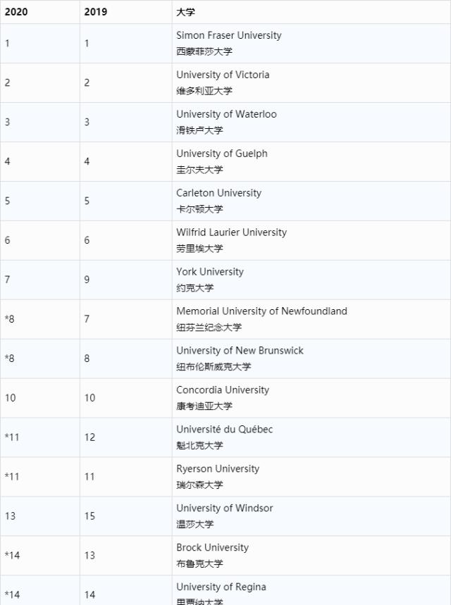 在基础类院校中,蒙特爱立森大学、北英属哥伦比亚大学和特伦特大学分列一二三位。莱斯布里奇大学此次冲进前五。