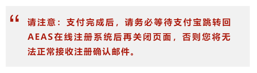 提交信息后,系统会自动跳转到支付宝支付页面,申请者可以选择即时支付,或通过报名确认邮件中的支付链接在有效期内完成付款。