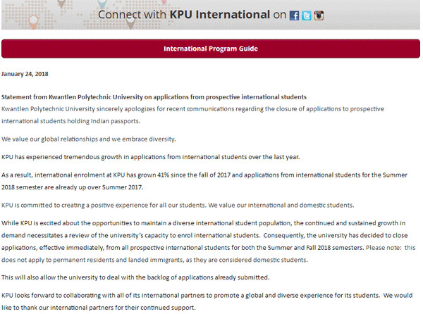 前不久,加拿大昆特兰理工大学(KPU)突然在官网发布声明,停止招收2018年夏季(5月)、秋季(9月)的国际留学生,准备去KPU的同学们顿时炸了锅。
