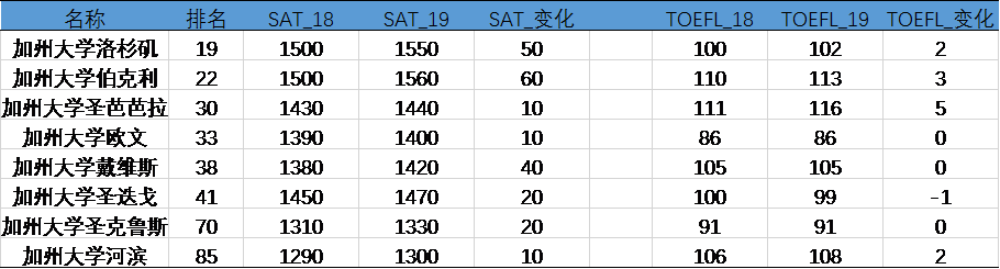 因加州大学旧金山分校仅录取医学类硕士以上学生,加州大学美嘉德分校样本数据过少不在考虑范围。由上表可发现最近两年录取新生中, SAT 成绩要求均有提升,平均上涨 28 分。而托福成绩则变化不明显。