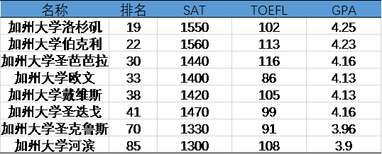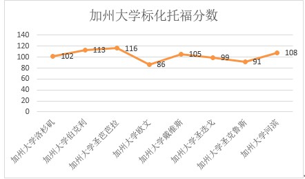 从表中可看出,语言成绩并未像 SAT 成绩一样呈现出明显的变化趋势,但加州大学欧文分校( UCI )和加州大学圣克鲁兹分校( UCSC )对于托福要求相对偏低,标化成绩分别为 86 分和 91 分。