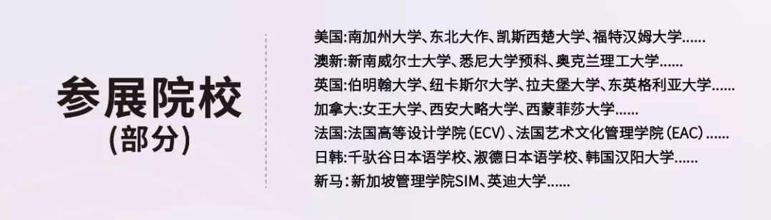 在本次招生会中,将有400+海外院校直达现场,包括来自美国、英国、加拿大、澳大利亚、新西兰等26个国家和地区的院校与你零距离接触,你可以在现场与各个院校进行无障碍沟通,倾听院校招生政策及反馈,还有机会赢得面试会专属奖学金,直接领取offer!