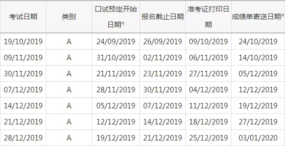 2019年11-12月用于英国签证及移民的雅思考试机考考试日期、准考证打印日期和成绩单寄送日期
