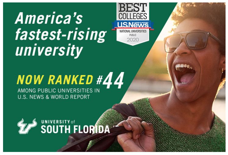 根据 U.S. News an Worl Report《美国新闻与世界报道》发布的最新排名,南佛罗里达大学正迅速跻身美国最佳公立大学榜单,目前排名上升为第 44 位 。 相比比去年上升了14位, 连续四年再次刷新南佛在该榜单的最佳记录 。