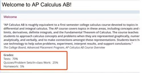比如上方学校的微积分AB课程,对考试要求非常高,占比70%,然后平时作业重要性就只有5%。