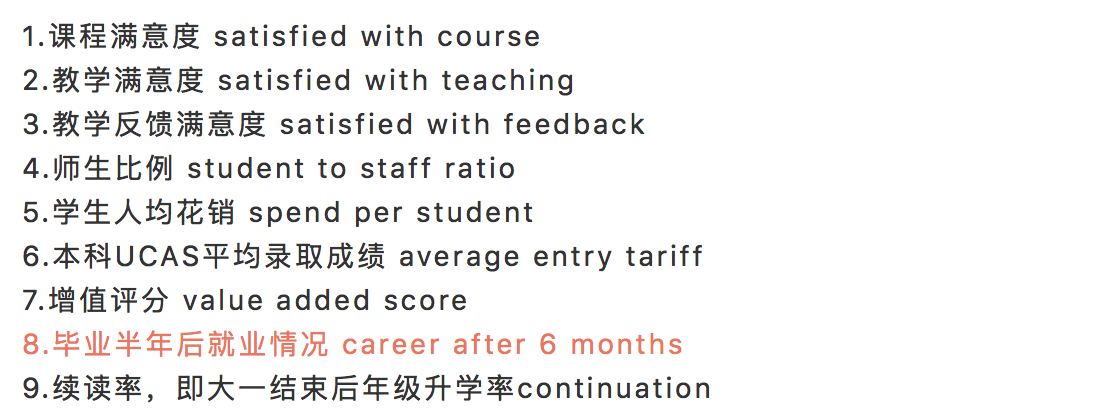 《卫报》大学排名一共有九大参考指标,并由英国大学生满意度调查(NSS)来打分: