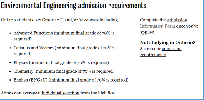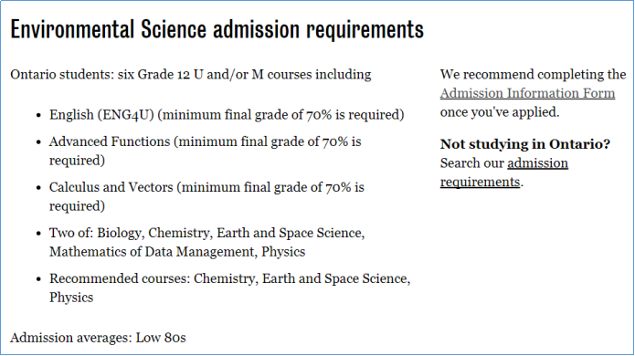 如果是申请大学,学习环境科学和环境工程专业,对高中阶段的先修课程的要求也是不一样的,以在安省读高中的学生申请滑铁卢大学为例: