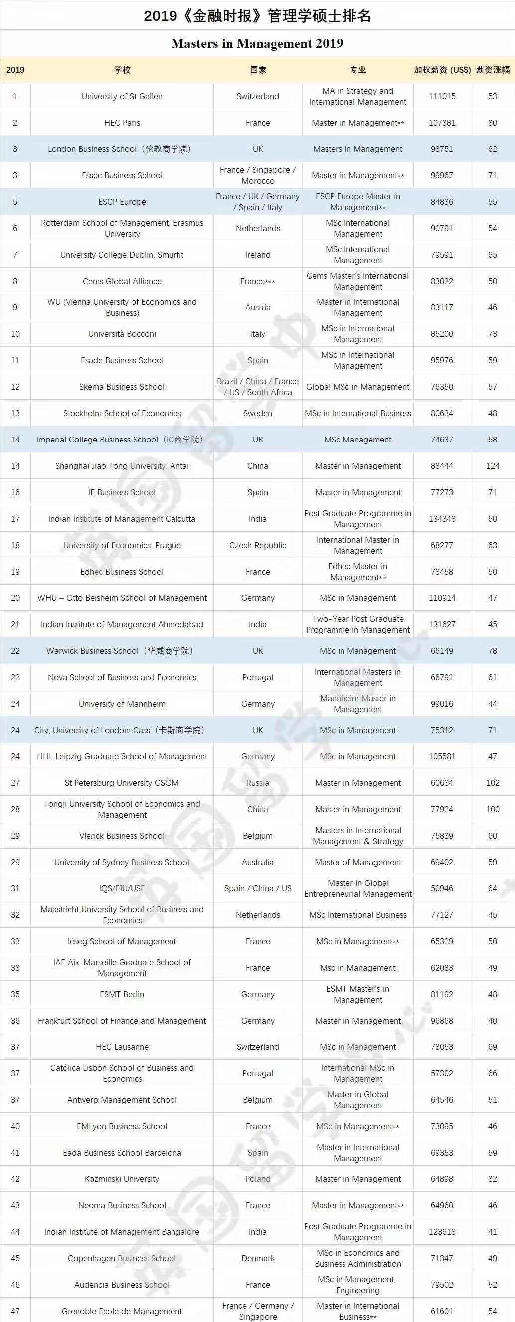 2019金融时报(Financial Times)全球管理学硕士排名昨天公布了,是该细分领域最权威的世界排名之一。值得关注一下的,排名如图 :