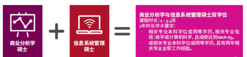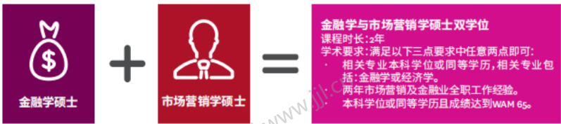 以麦考瑞大学商科方向硕士双学位为例,学生可以结合金融(Finance)、市场营销(Marketing)、媒体与传播(Meia an Communications)、国际关系(International Relations)、商业分析(Business Analytics)等热门专业,组合成具有高竞争力的双学位。