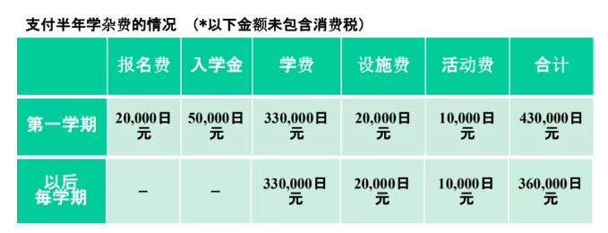 第一学期学费一览 (单位:日元)