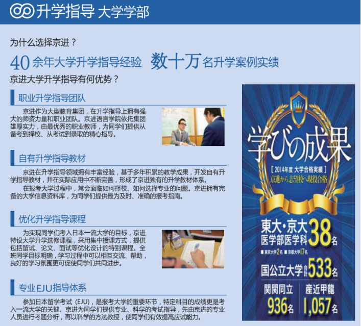 京进教育集团根据学生的不同学历层次和升学需求,在东京,京都等地开设了九所语言学校,并由中川良雄等多位在日本教育界享有盛誉的教授担任校长。每年有众多毕业生考入东京大学、一桥大学、横滨国立大学、早稻田大学等日本名校。