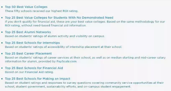 加上跟其他权威机构的合作,比如像PayScale.com,使得各项数据变得更为精准,发布的排名也成为了学生们申请学校时习惯参考的排名之一。