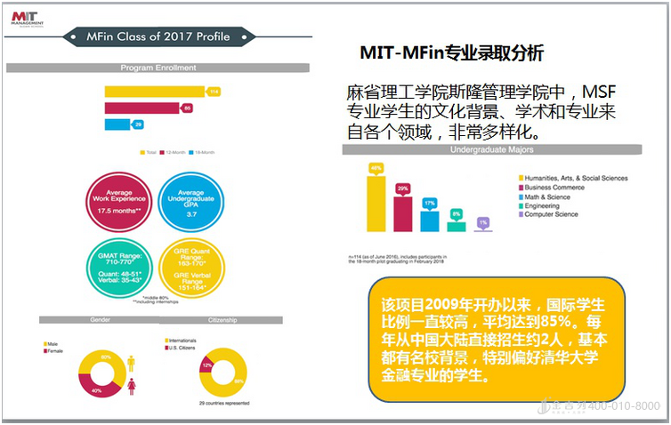 我们可以看到 MIT 的 MSF: 商科背景的学生占有 29% , 数理背景的学生占有 17% , 工程的学生占有 8% ,计算机背景的学生占有 1% ,但是还有 45% 的学生来自人文,社科类。虽然数据每年都有变化,但这是否代表 Sloan 商学院的金融硕士就不要求背景呢?(言外之意, MIT 都对背景没有严苛要求,其他院校还要么?)