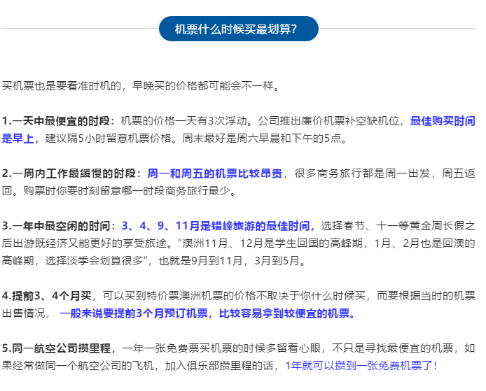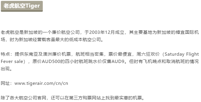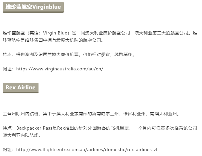 特点:价格稍贵,线路齐全,可供乘客选择的空间更大。澳洲航空有时也会推出特价机票。