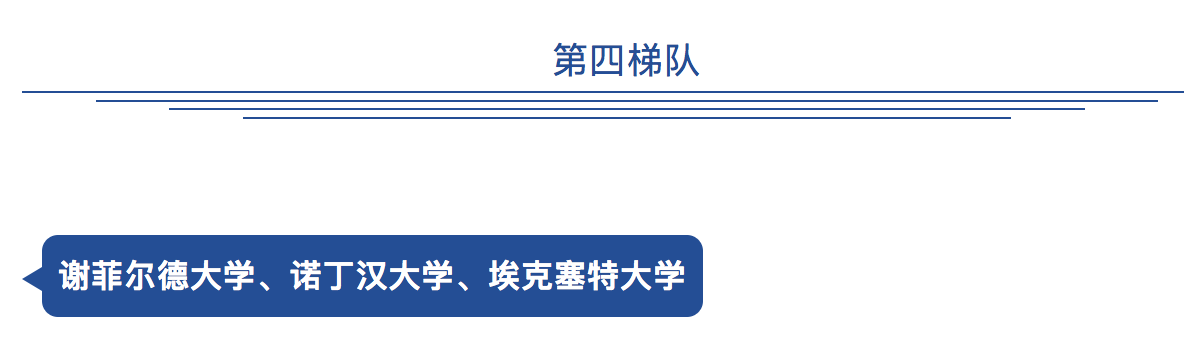 排在第四梯队的谢菲尔德大学、诺丁汉大学和埃克塞特大学,都有各自的王牌专业。谢菲尔德大学建议国内网大排名前200名或成绩特别优秀的学生递交申请,埃克塞特大学也会卡排名和核心课程。诺丁汉大学对每个专业都有不同的要求,均分最好在85分以上。这几所大学的共同特点是,都特别青睐985/211大学,均分要求低。