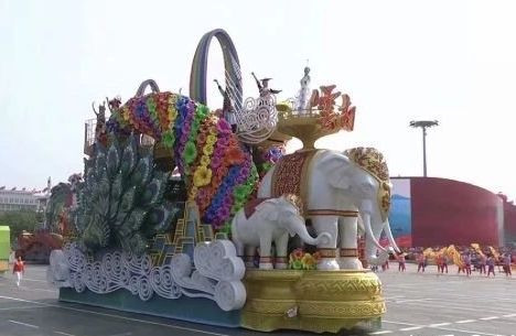 这辆花车侧面的开屏孔雀非常惊艳,车前憨态可掬的白象,更是佛教文化中的祥瑞。云南是国内唯一拥有野生大象的地方,白象花车可以说是非常有特色了。
