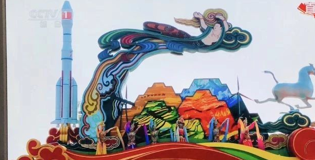 来自甘肃的花车让人眼前一亮~小迪看到了马踏飞燕,还有敦煌的壁画。 最后的火箭是不是象征着酒泉卫星发射基地呢?