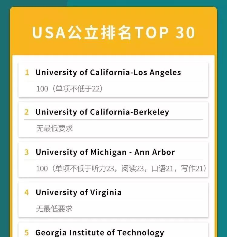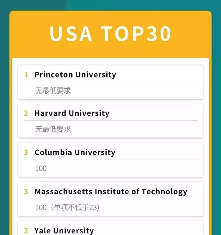 最新! 托福官方联手《U.S. News an Worl Report》(以下简称 U.S.News)重磅发布全美综合名校排行榜,TOP30美国名校托福成绩要求。