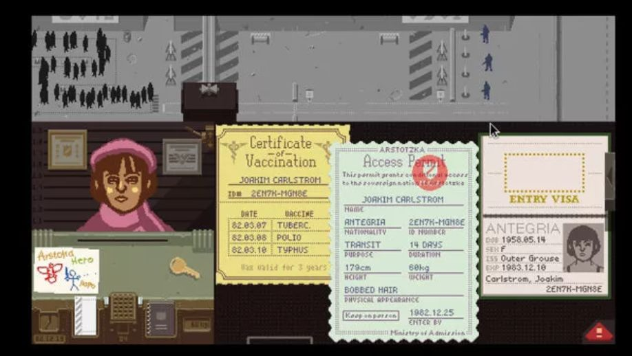 在《请出示证件》(Papers, Please)这款游戏中,玩家扮演一位移民检察员,其职责便是在边防站接待申请入境的各色人等,检查他们提交的入境材料,并决定是否放他们入境。