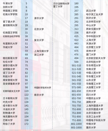 2019年QS世界排名之英国与中国大学对比: