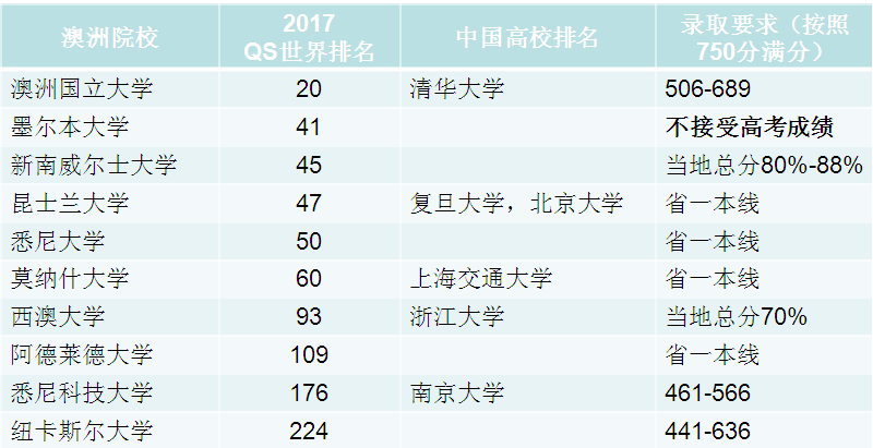 下图就是澳洲大学针对国内高考的分数要求,学生符合要求就可以直接读大一。